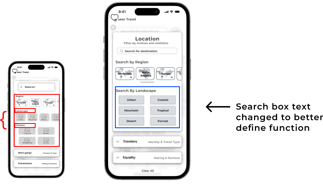 The feedback from users was that the phrase “ Where to"?” did not clearly indicate the function of searching. I relabeled the input field with words “Search Destination”" which more directly described the task required to engage with the function of the app.