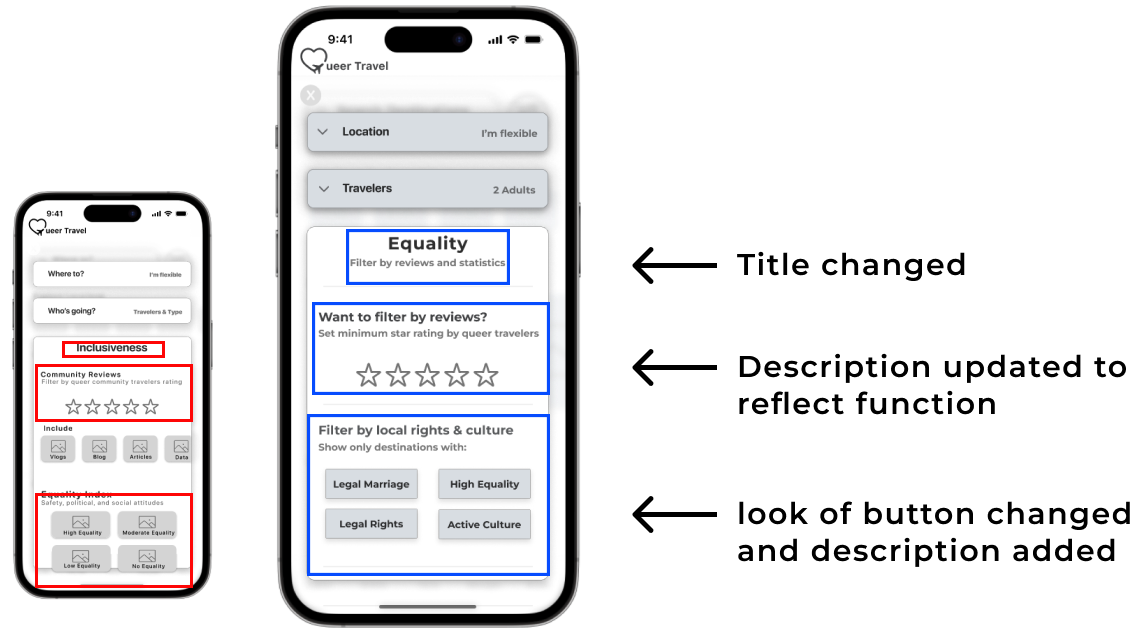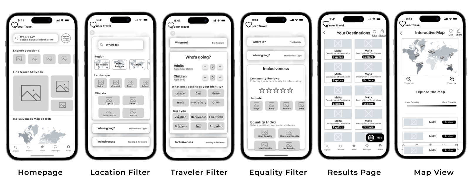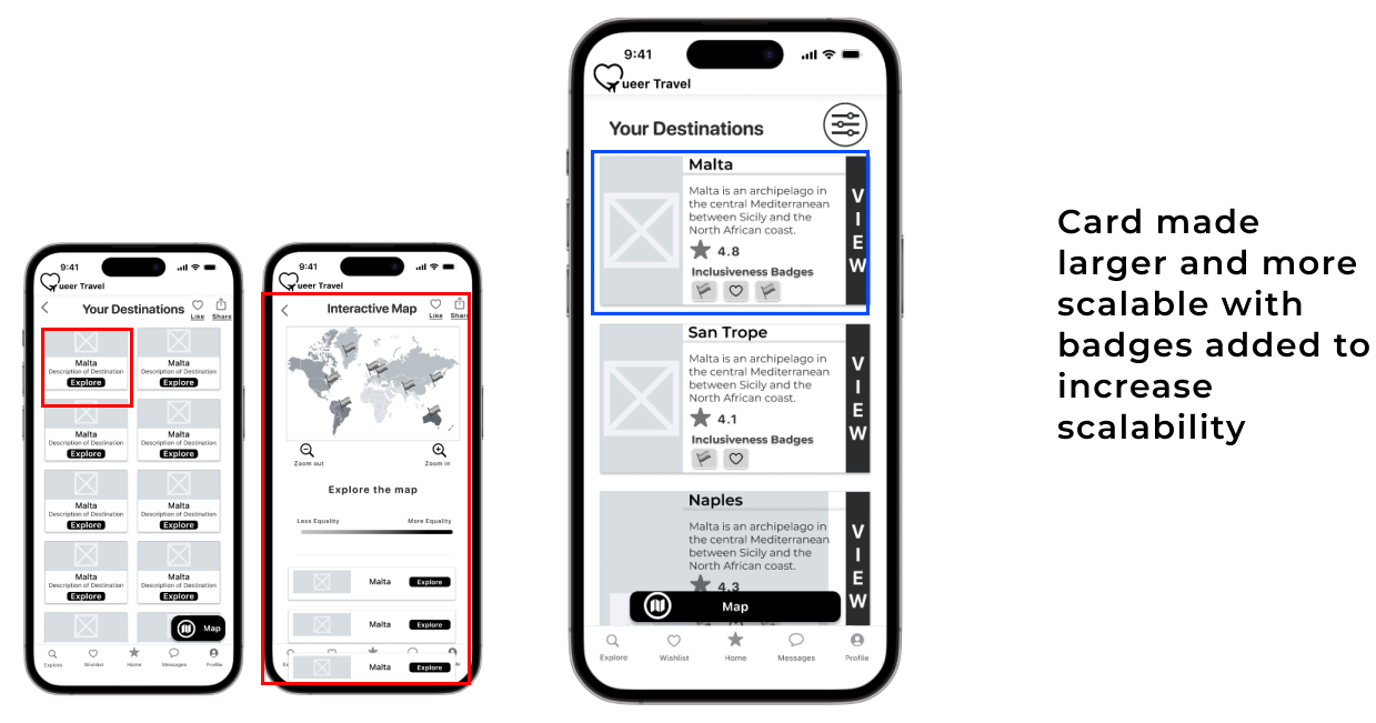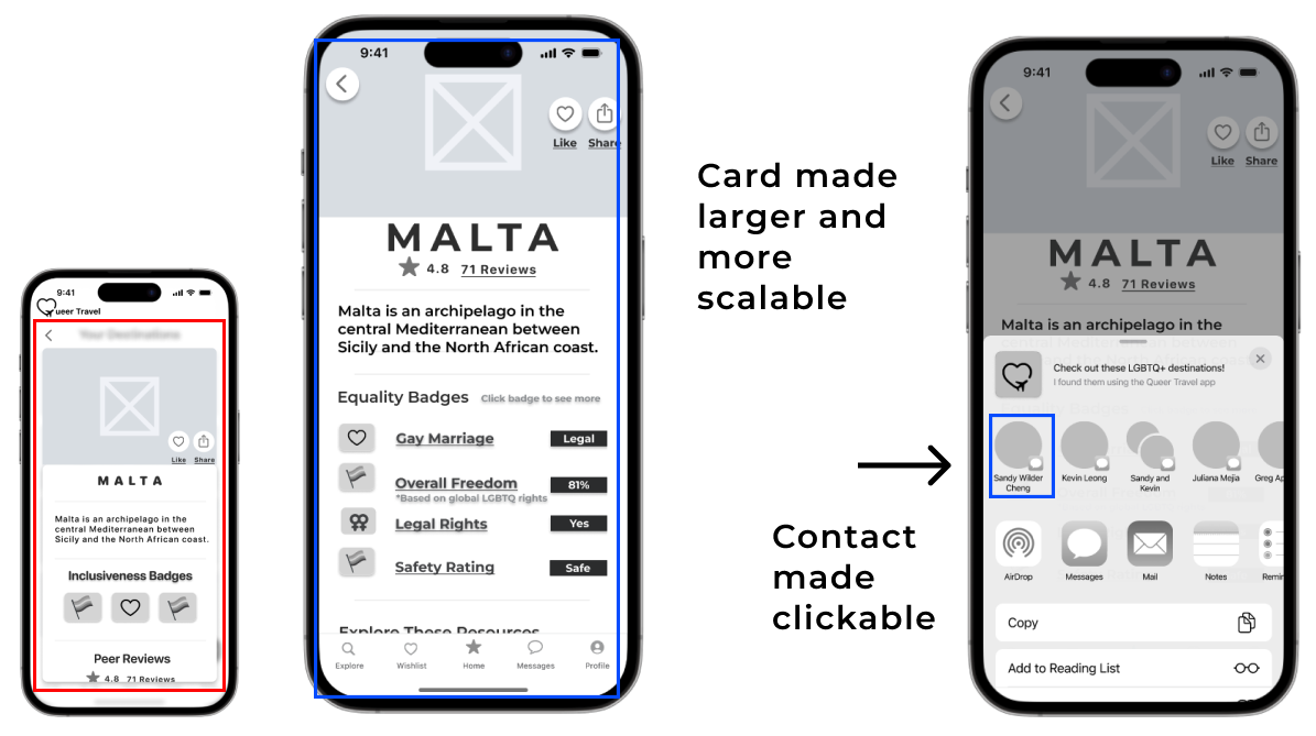I carried out user testing in two rounds, with five participants in each, incorporating changes to the prototype between each round. All users were tasked with the same assignment: searching for a destination by filtering for region, travelers, and equality preferences, then sharing the destination Malta. After giving them the task prompt, I refrained from leading questions or offering hints, allowing users to explore the app organically. This approach enabled me to observe their natural navigation without external influence.