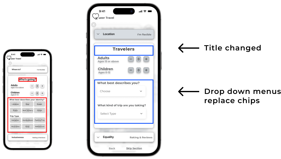 Similar to the homepage search input, users found the phrase “Who’s Going? unclear, so it was changed to a more descriptive word, “Travelers”.