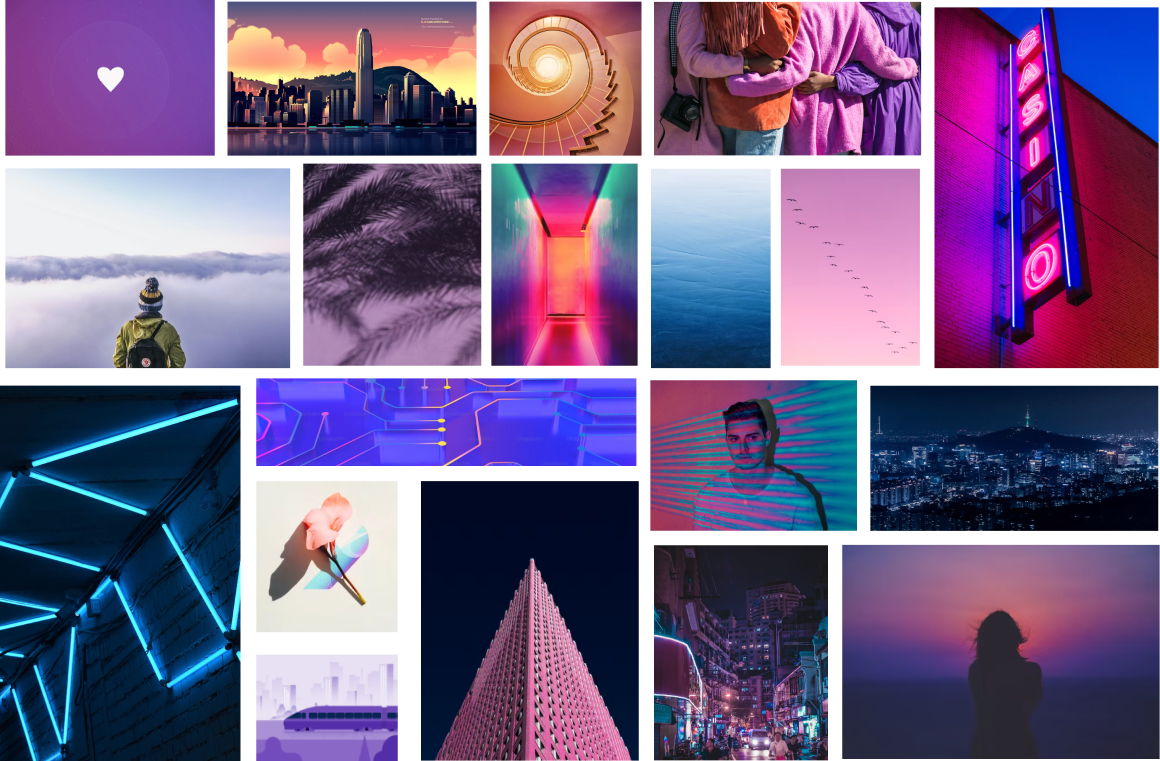 I approached the mood board process by sourcing design inspiration from photography, illustration, graphics and existing products the evoked the "“feeling” of the app. I looked for sleek and modern designs that had a largely back and white color scheme with a splash of color. The colors and layers that emerged had dark dominant shades with neon highlights.
