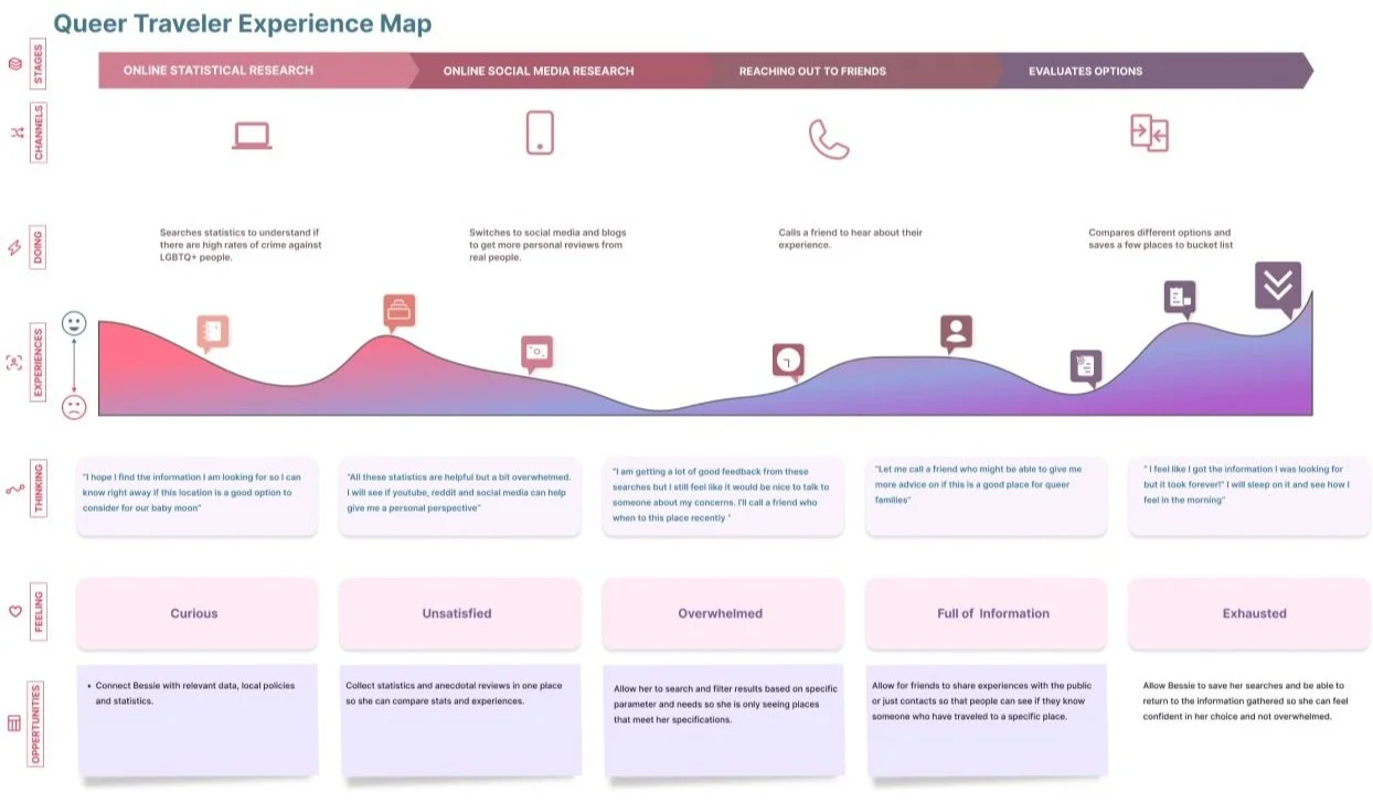 This map provides insight into Bessie's journey as she seeks information and makes decisions about her vacation destination. It highlights her pain points, objectives, and driving forces, shedding light on the challenges she faces while sifting through the vast amount of online information. Moreover, it uncovers potential opportunities to simplify and enhance her experience.